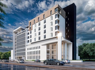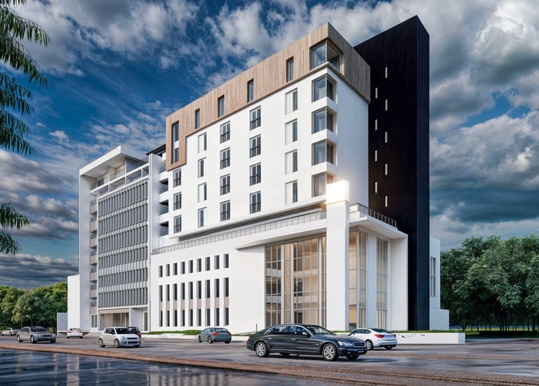 Situé dans l'une des zones d'activités les plus dynamiques d'Alger, cet ensemble architectural répond aux exigences du monde des affaires moderne. Le projet articule avec fluidité un hôtel urbain 3 étoiles, des plateaux de bureaux modulables à forte valeur ajoutée et une salle des fêtes polyvalente. Couronnant l'édifice, un restaurant panoramique offre une vue imprenable sur le quartier d'affaires, faisant de cet immeuble un point de repère incontournable pour la clientèle business et événementielle.